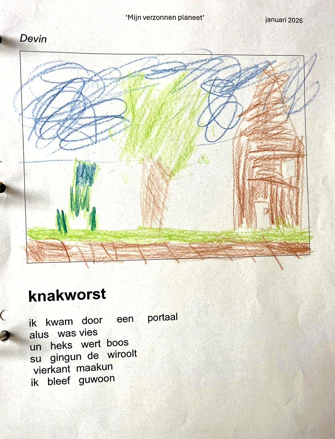 Ik kreeg een foto doorgestuurd: kleinzoon (7) had blijkbaar een project gedraaid op zijn werk (groep 3) wat resulteerde in een hard-copy tekening met tekst: