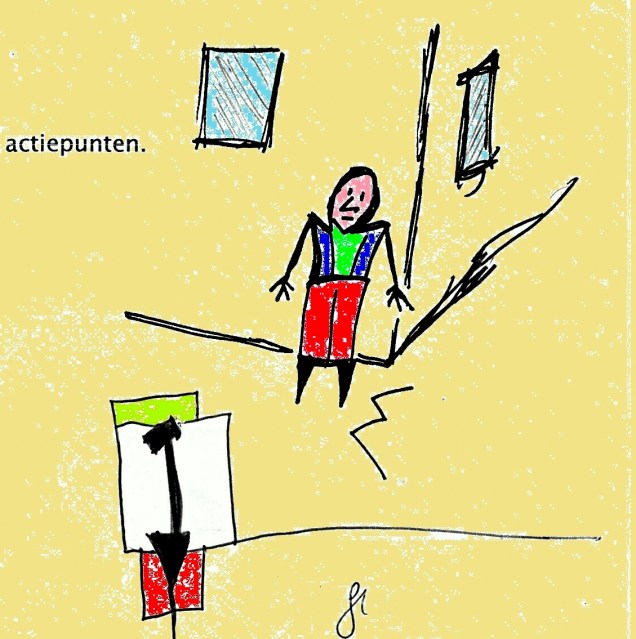 “- Relaxen (woonkamer, tuin, terras)” – In de woonkamer wonen we dus eigenlijk, maar dan zou de functie van wonen alleen “effe zitte” zijn…volgens mij lopen we er vooral doorheen, onderweg naar iets anders, maar dat is niet ontspannend. En iedereen met een tuin weet dat het daar heel ontspannend, maar evenzogoed hard werken is. In de woonkamer wordt ook bezoek ontvangen, in ‘de mooie kamer’ op de beletage worden de meestgewichtige en luchtige gesprekken gevoerd, veel minder aan de spreekwoordelijke keukentafel. Relaxen? Hmmm… En wat betreft essentiële elementen… de zitelementen, of toch de laptop en/of tv? Het raam naar buiten: uitzien op de straat. Ja, dat is het. Communicatie is hier het essentiële element, inclusief de internetaansluiting die niet aan een bepaalde ruimte is gebonden. De woonkamer is de interface tussen de privé wereld en de openbare buitenwereld, waarin we