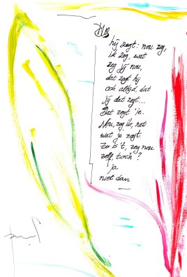 De afgelopen tien jaar heb ik een derde, witte ordner volgeschreven en vandaag de dag verzamel ik teksten in een blauwe. Ook hieruit hoop ik in de toekomst een selectie te laten verschijnen. Bij de samenstelling van deze bundel heb ik me niet alleen beperkt in de tijd, maar ook in de lengte van de teksten. De langere teksten zijn ook inhoudelijk anders, meer poëtisch proza. Misschien moet daar ook maar een apart bundeltje van komen…