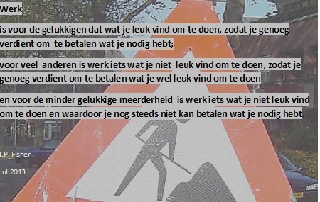 “- Werken (study)”, de studeer- en/of hobbykamer, de bibliotheek. Essentieel element is hier de tafel. Geen eettafel maar werktafel, in de brede zin, tot aan strijkplank. En als ik zeg dat we in de buitenwereld werken is het eerder zo, dat daar het resultaat van ons werk zich materialiseert. Iets te filosofisch verwoord, kort door de bocht? Jammer dan, misschien kom ik er later op terug. Want werken, daar kan ik nog wel een paar woorden meer over kwijt. Alles is werk. Alles wat moet. Wonen is een werkwoord.