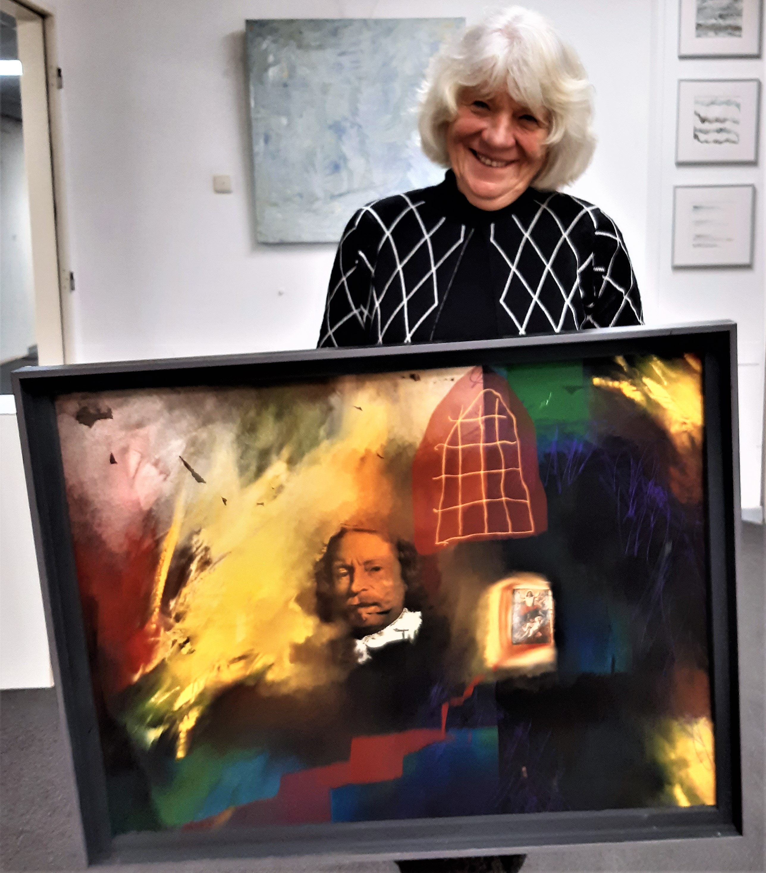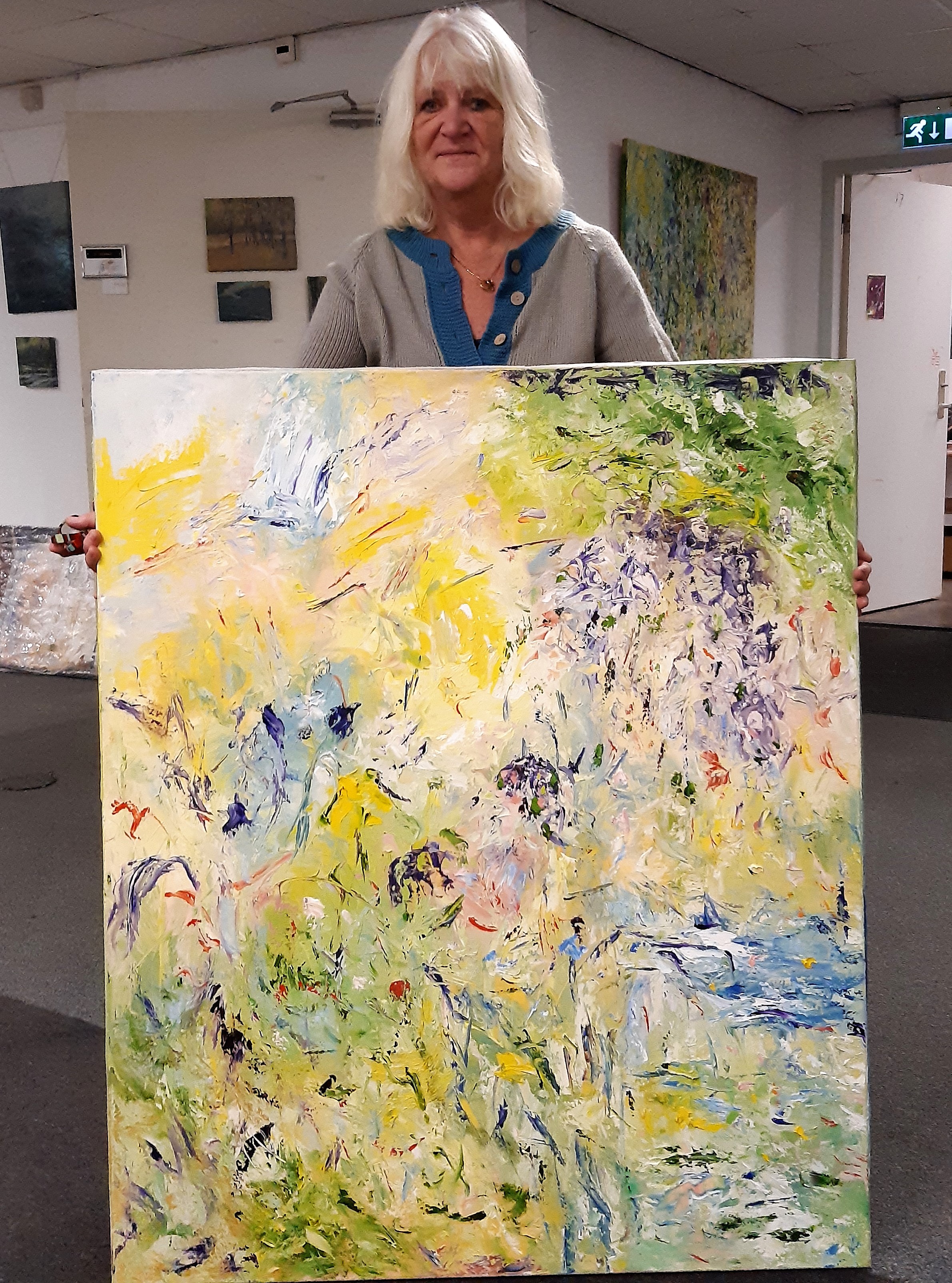 Magdalena kennen we uit Soest en is, onder andere, praktisch filosoof. “In de ‘struggle for life’ heb ik van alles gedaan om het hoofd boven water te houden. Ik begon eigenlijk met schilderen toen ik in Soest kwam wonen, in 2003, om uit te beelden wat ik niet onder woorden kon brengen. Nu kan ik het veroorloven mij geheel aan de creativiteit te wijden. Ik schreef altijd veel, en schrijf nog steeds vaak gedichten bij mijn schilderijen. Daarin probeer ik een glimp achter de werkelijkheid weer te geven.” Veel werken van Magdalena zijn een soort abstracte landschappen waar de toeschouwer, maar ook de maker, op zoek gaan.