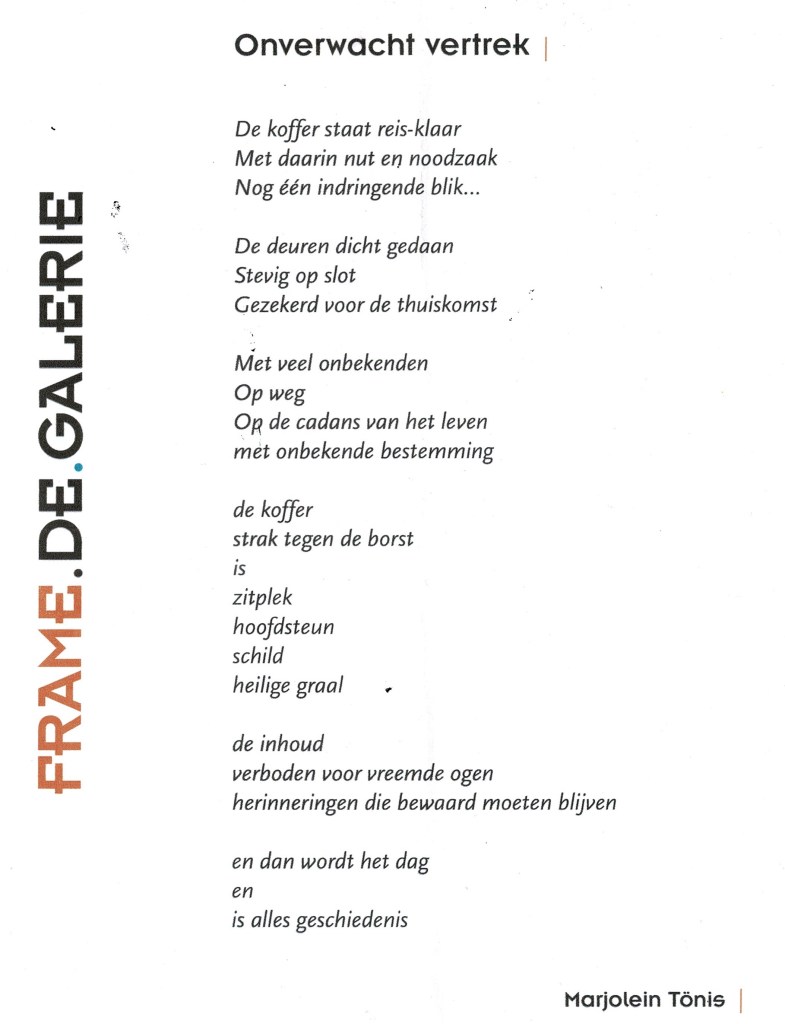 Tijdens het gesprek vertelde Marjolein Tönis over een project waar mee bezig was in het kader van Vrijheid. In gesprekken met Hadwijch was ze daarbij gekomen op het maken van loden koffertjes. Daar had ze ook een gedicht bij gemaakt. Ik was er nogal van onder de indruk. Neem maar mee, zei ze. Het koffertje was inderdaad loodzwaar, ik kreeg het echt niet zwierig opgetild. Het papier met het gedicht ging mee in de binnenzak.