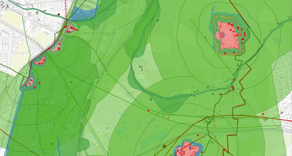 We zien het Houtensepad en de Oude Liesbosweg als enige wegen. de Koppeldijk is nog naamloos. Rond de forten staan cirkels die het schootsveld van de kanonnen aangeven – daar moest het leeg en vlak blijven om goed te kunnen mikken. Een deel van de Houtensche weg, nu de Waterlinieweg, was een militaire weg die bovenlangs de Utrechtse lunetten liep. Aan de andere kant van het schootsveld volgt de huidige Rijksweg A12 grofweg de Limes, de verdedigingslinie die de Romeinen achttien eeuwen eerder hadden aangelegd.