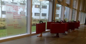 (*) de tekst naast de koffervoeten tussen de roltrappen in het Martini: