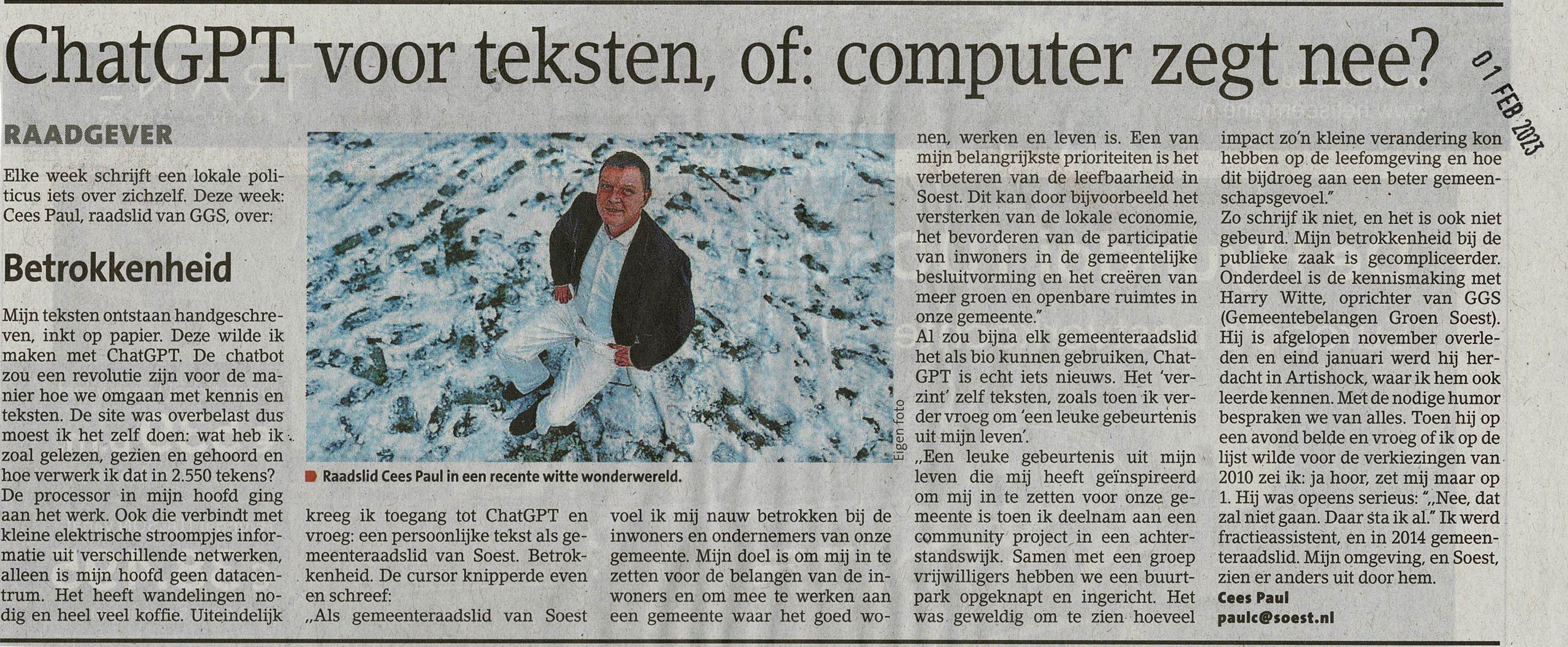 Mijn teksten ontstaan handgeschreven, inkt op papier. Deze wilde ik maken met ChatGPT. De chatbot zou een revolutie zijn voor de manier hoe we omgaan met kennis en teksten. De site was overbelast dus moest ik het zelf doen: wat heb ik zoal gelezen, gezien en gehoord en hoe verwerk ik dat in 2.550 tekens? De processor in mijn hoofd ging aan het werk. Ook die verbindt met kleine elektrische stroompjes informatie uit verschillende netwerken, alleen is mijn hoofd geen datacentrum. Het heeft wandelingen nodig en heel veel koffie. Uiteindelijk kreeg ik toegang tot ChatGPT en vroeg: “een persoonlijke tekst als gemeenteraadslid van Soest. Betrokkenheid.” De cursor knipperde even en schreef: